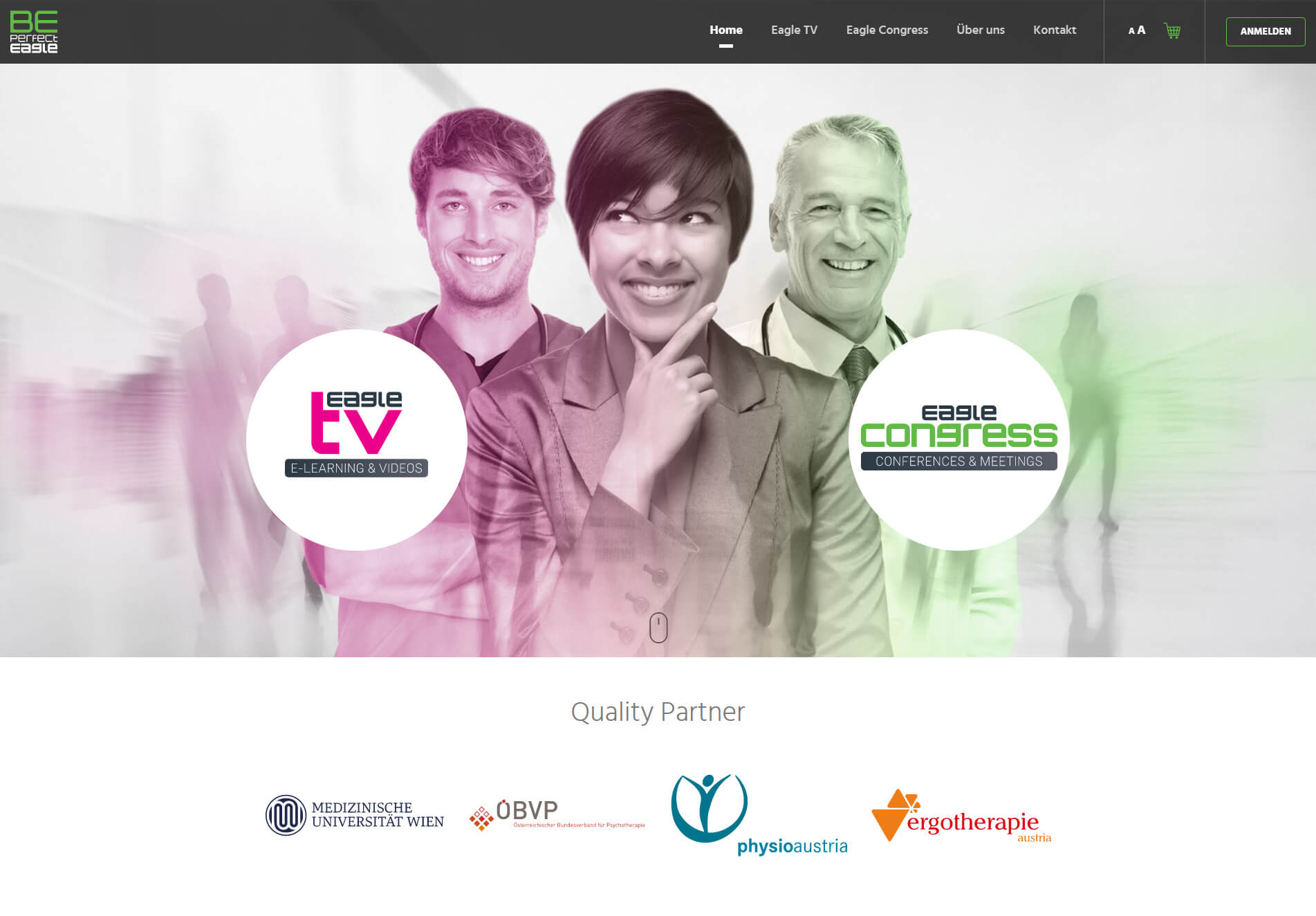 Be Perfect Eagle GmbH is an Austrian company specializing in the overall organization and implementation of national and international events in the field of health and health care. On the new, organized websites, two primary functions are easy to access - Eagle TV and Eagle Congress. Every health professional who is not able to attend seminars for which they can pay fee through the web, can also attend e-learning courses, after which they earn points online by solving final thematic questions.