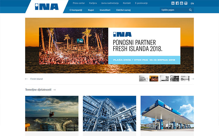 INA, d.d. je srednje velika europska naftna kompanija s vodećom ulogom u naftnom poslovanju u Hrvatskoj te značajnom ulogom u regiji. Nove u potpunosti redizajnirane stranice osim moderne responzivne prezentacije sadržavaju novu strukturu weba. Korporativni podaci o kompaniji, temeljne vrijednosti, pozicija u regiji i sve druge podatke, kao i servisne informacije o djelatnostima nalaze se na novim web stranicama. Osim tražilice benzinskih postaja pronađite i posebne ponude na postajama, ali i upute za korištenje INA mobilne aplikacije.