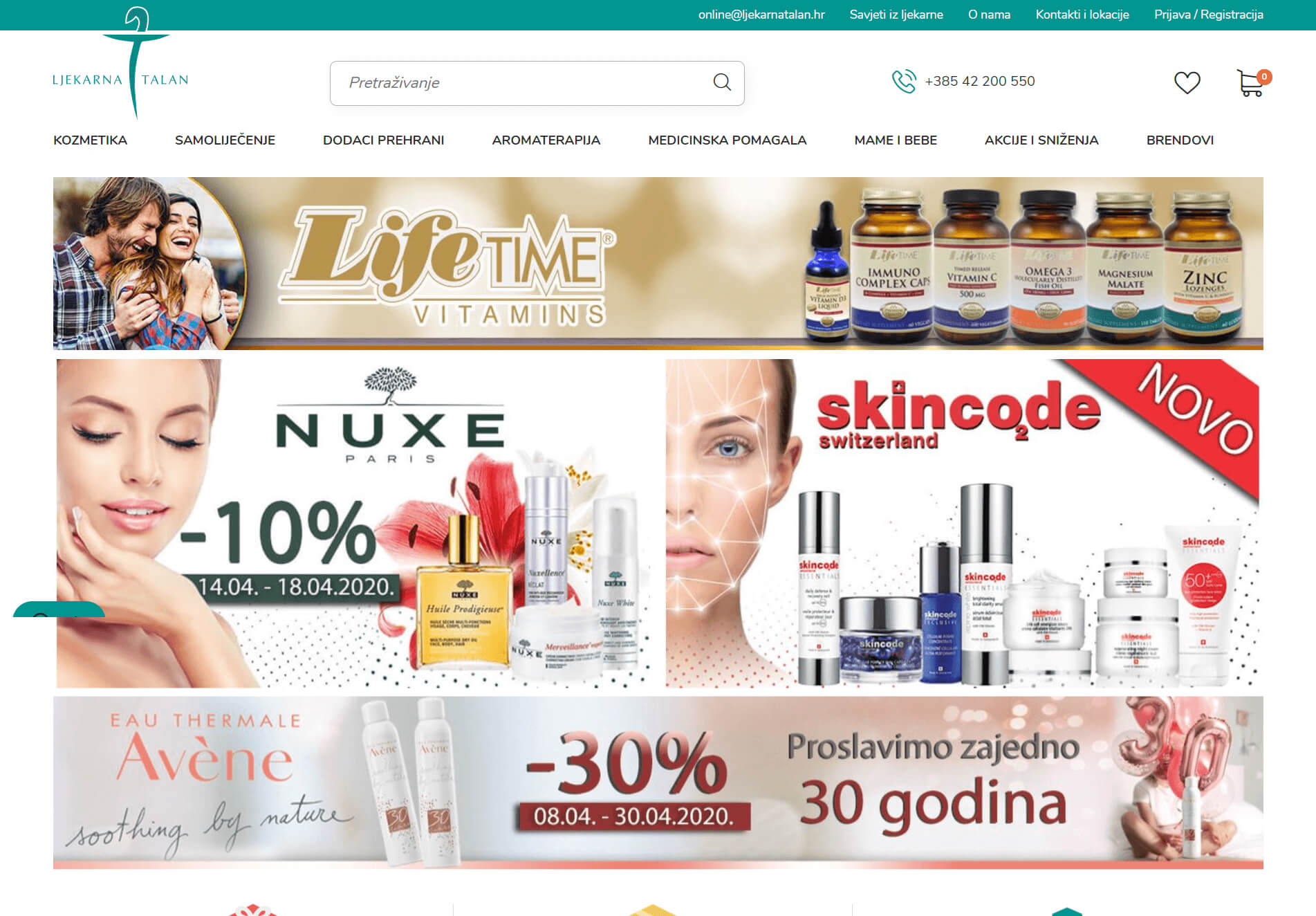 Ljekarna Talan je zdravstvena ustanova čije dugogodišnje iskustvo omogućuje korisnicama profesionalnu, kvalitetnu i brzu uslugu. Prateći tehnološki napredak pokrenuta je online trgovina, a Globaldizajn je razvojem novom web shopa omogućio da upravljanje asortimanom i dostupnim proizvodima bude još jednostavnije. Provjerite najnoviju ponudu velikih brandova te aktualne promocije na jednom mjestu. E-commerce platforma prilagođena je potrebama farmaceutske industrije, a sve dostupne proizvode možete provjeriti na stranicama ili se javiti s upitom ukoliko vas nešto posebno zanima.