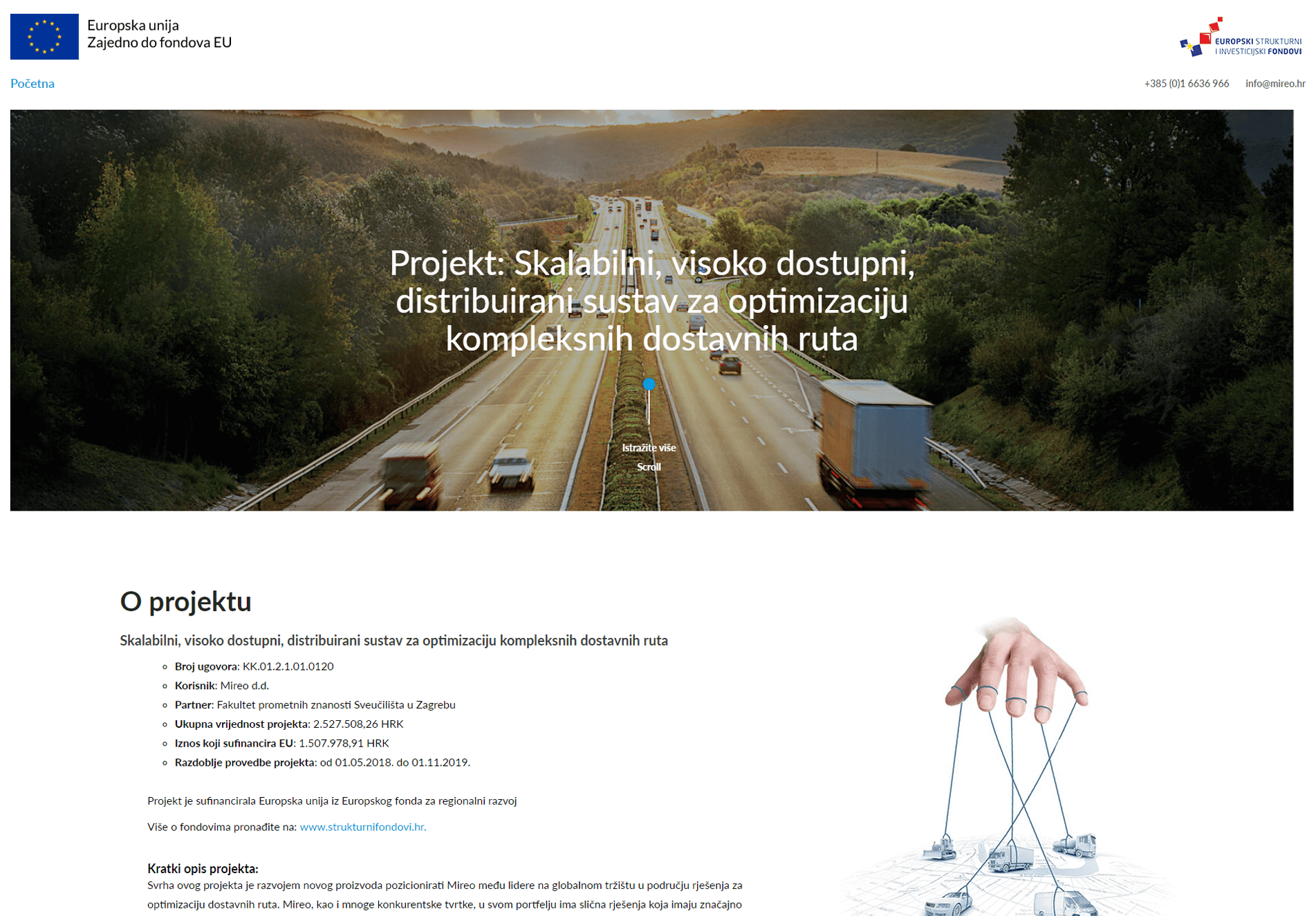 Za našeg dugogodišnjeg partnera Mireo d.o.o. napravili smo webpage s ključnim informacijama u vezi uspješnog projekta na kojem su surađivali s Fakultetom prometnih znanosti. Riječ je o sustavu za optimizaciju kompleksnih dostavnih ruta. Zavirite na novi, prezentacijski webpage, informirajte se ili prijavite na newsletter.