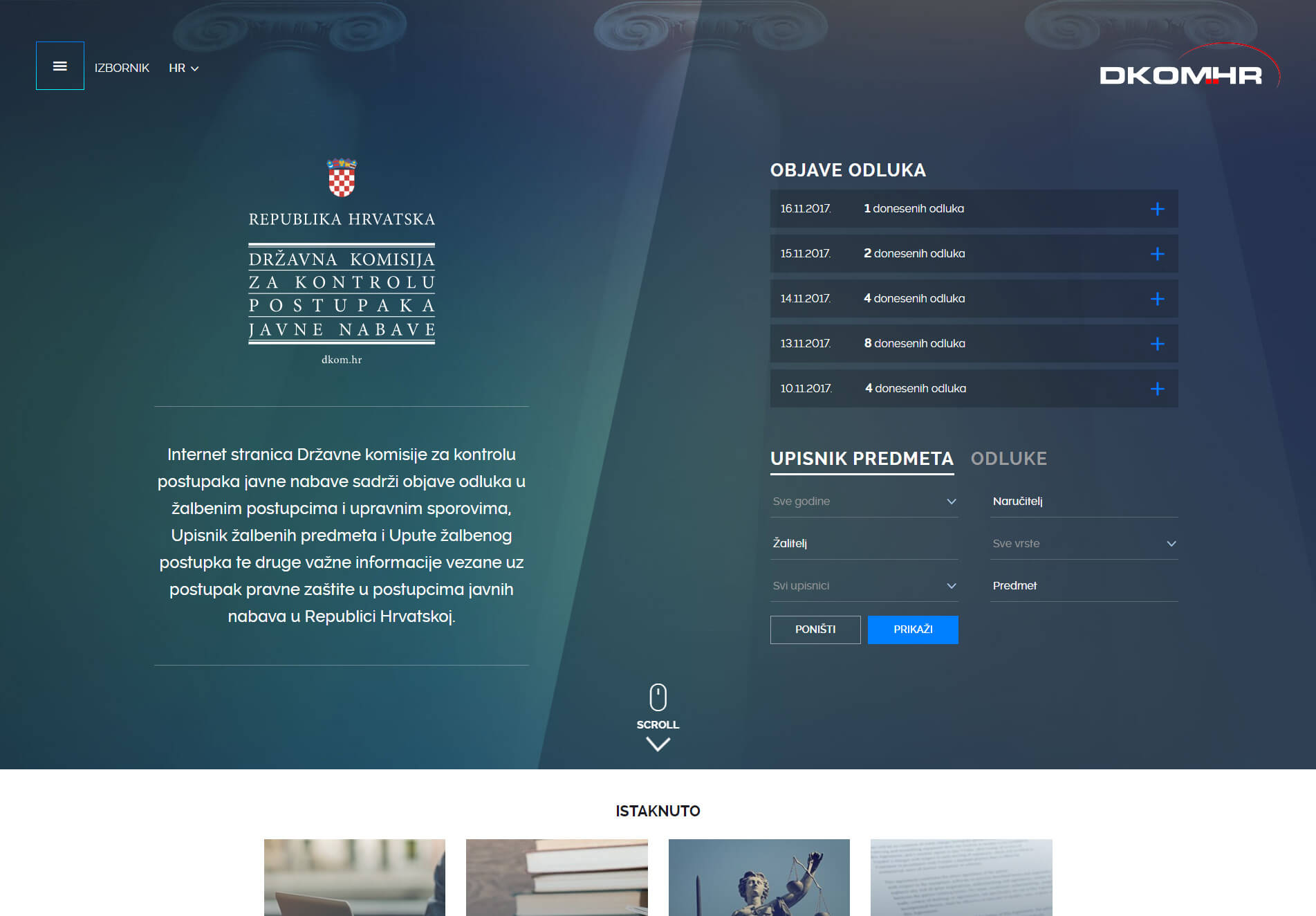 Nova, redizajnirana web stranica Državne komisije za kontrolu postupaka javne nabave zamišljena je kao alat namijenjen korisnicima i široj javnosti. Javno dostupni podaci, informacije o radu, postupcima i odlukama DKOM-a prikazuju transparentnost rada i funkcioniranja Komisije. Također, sadržaj web stranica osim preglednosti i lake dostupnosti ujedno je i novitet u postupcima pravne zaštite koji podiže standard na višu razinu. Dostupna je i aplikacija za vođenje predmeta kojom je podržano uvođenje mogućnosti izjavljivanja e-žalbe te vođenje postupaka u digitalnom obliku.