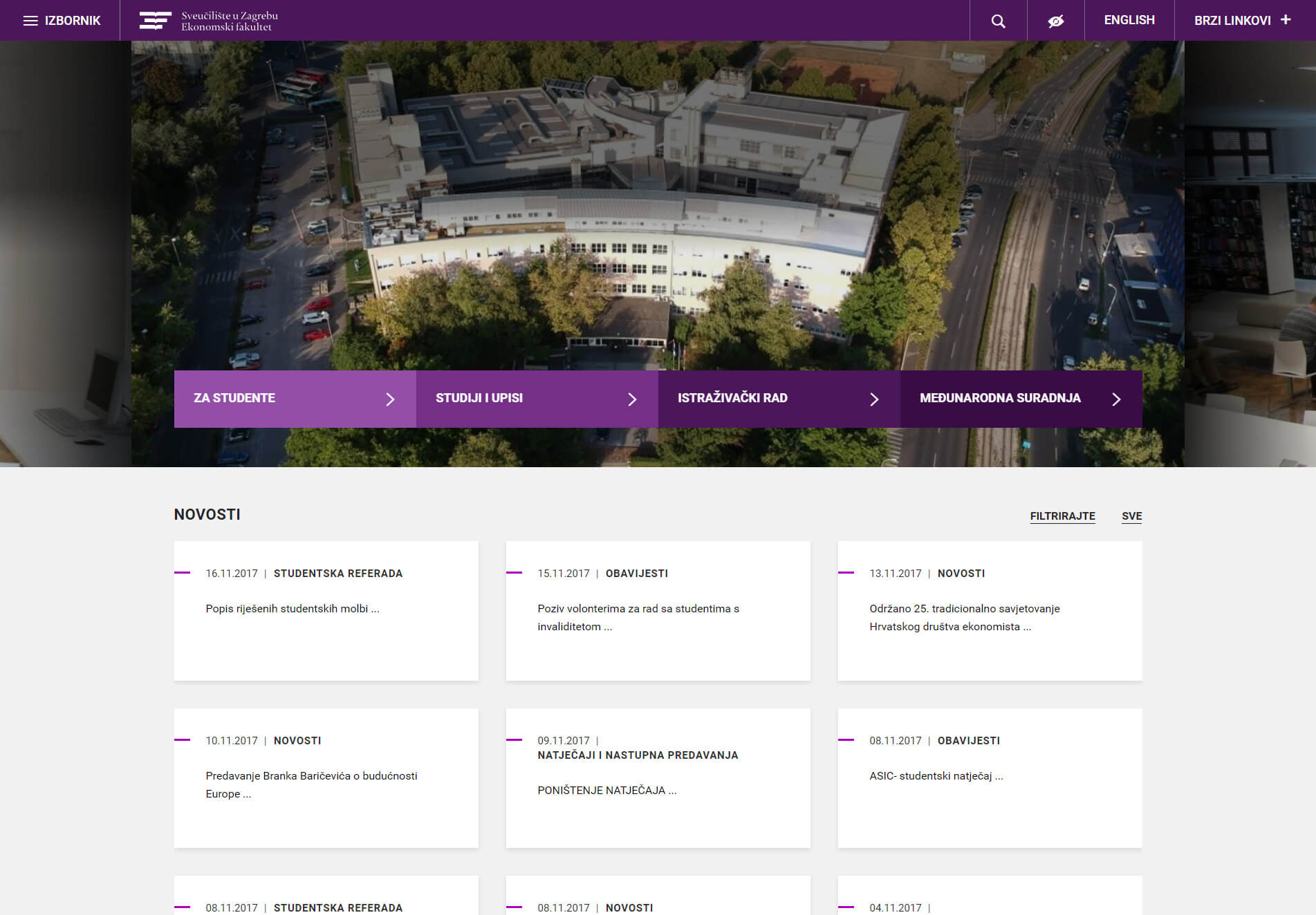 Nova, moderna web stranica Ekonomskog fakulteta u Zagrebu namijenjena je ne samo studentima, postojećim i budućim, već i profesorima te običnim građanima. Poveznice za sve potrebne informacije na jednom su mjestu, lako dostupne i pregledne, što ujedno olakšava samo studiranje. Popis i mogućnost downloada važnih dokumenata, raspored ispita i predavanja, kalendar, informacije o studentskoj udruzi, školarinama te niz drugih korisnih detalja dostupni su jednim klikom. Također, moguće je pretraživati stranicu i na engleskom jeziku.
