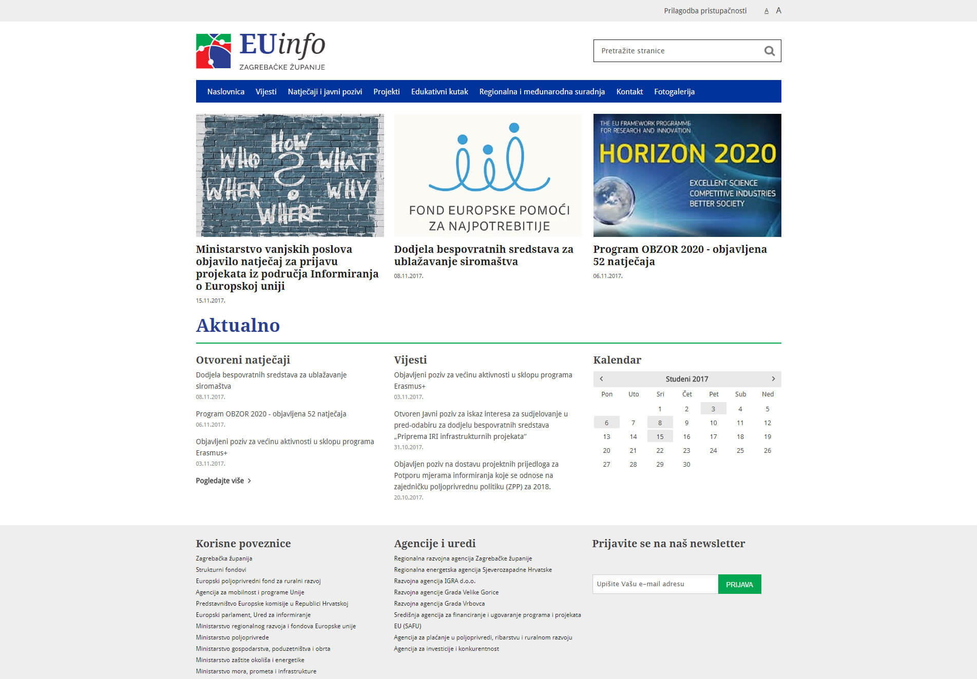 Vijesti, natječaji i javni pozivi, projekti te međunarodna i regionalna suradnja od sada su obuhvaćeni te se objavljuju na novoj web stranici www.euinfo.hr, koja sadrži sve potrebne EU informacije na području Zagrebačke županije. Kalendar edukacija i sastanaka, korisnih poveznica, mogućnost prijave na newsletter te interakcija direktno putem web stranice lako su dostupni te responzivna tehnologija omogućuje njihov jednostavan i brz pregled. Nova web stranica svakako će vam olakšati snalaženje i pomoći u potrazi za ključnim informacijama koje se odnose na područje Zagrebačke županije.