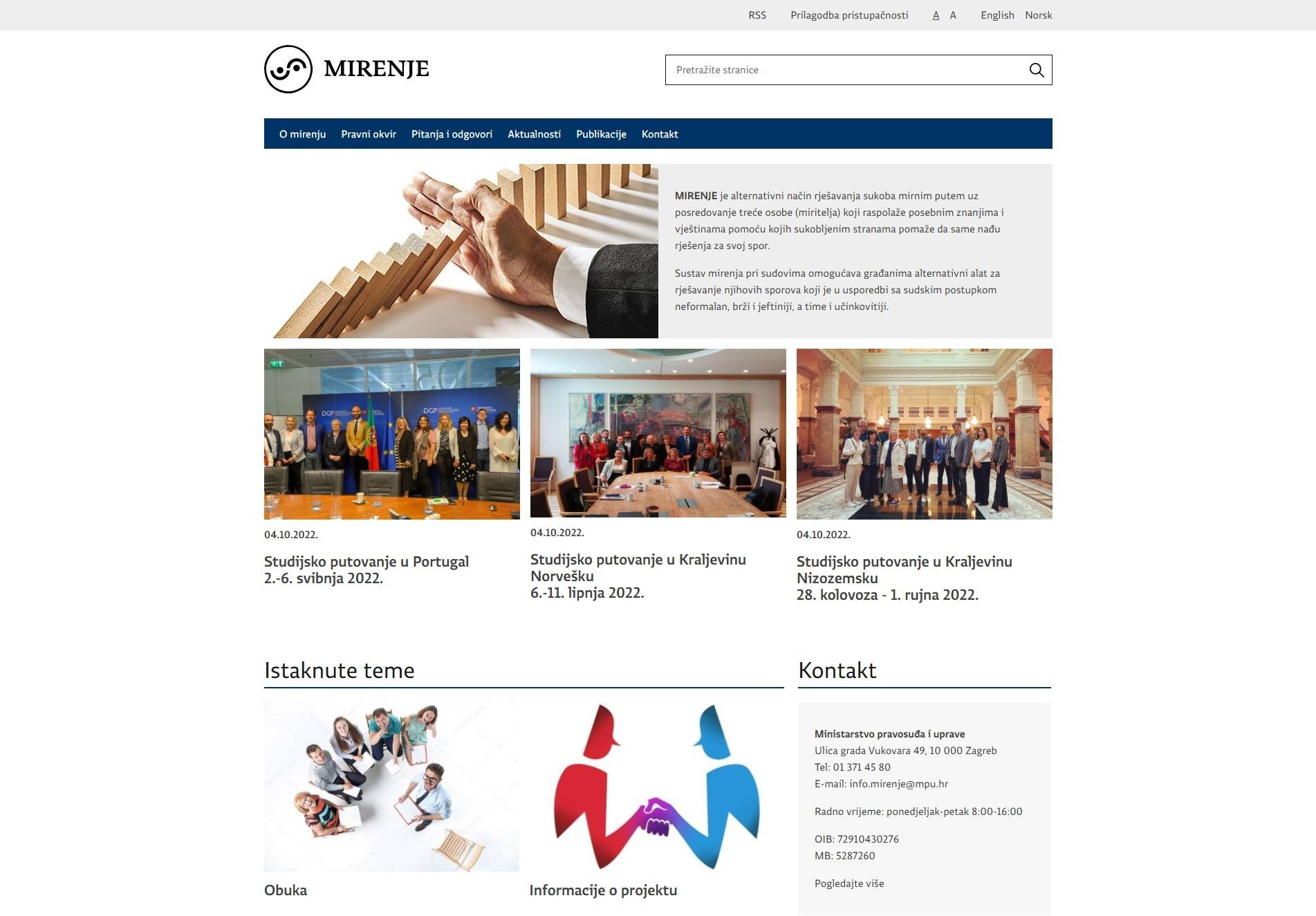 Za Ministarstvo pravosuđa i uprave izradili smo web stranicu - Mirenje. Na webu možete pronaći sve o mirenju (obliku posredovanja u kojemu stranke rješavaju vlastite sporove pod vodstvom i uz pomoć neovisne treće osobe). Također, navedeni su i pravni okviri sa svim pitanjima i odgovorima koji će vam odgovoriti kako pokrenuti navedeni postupak.