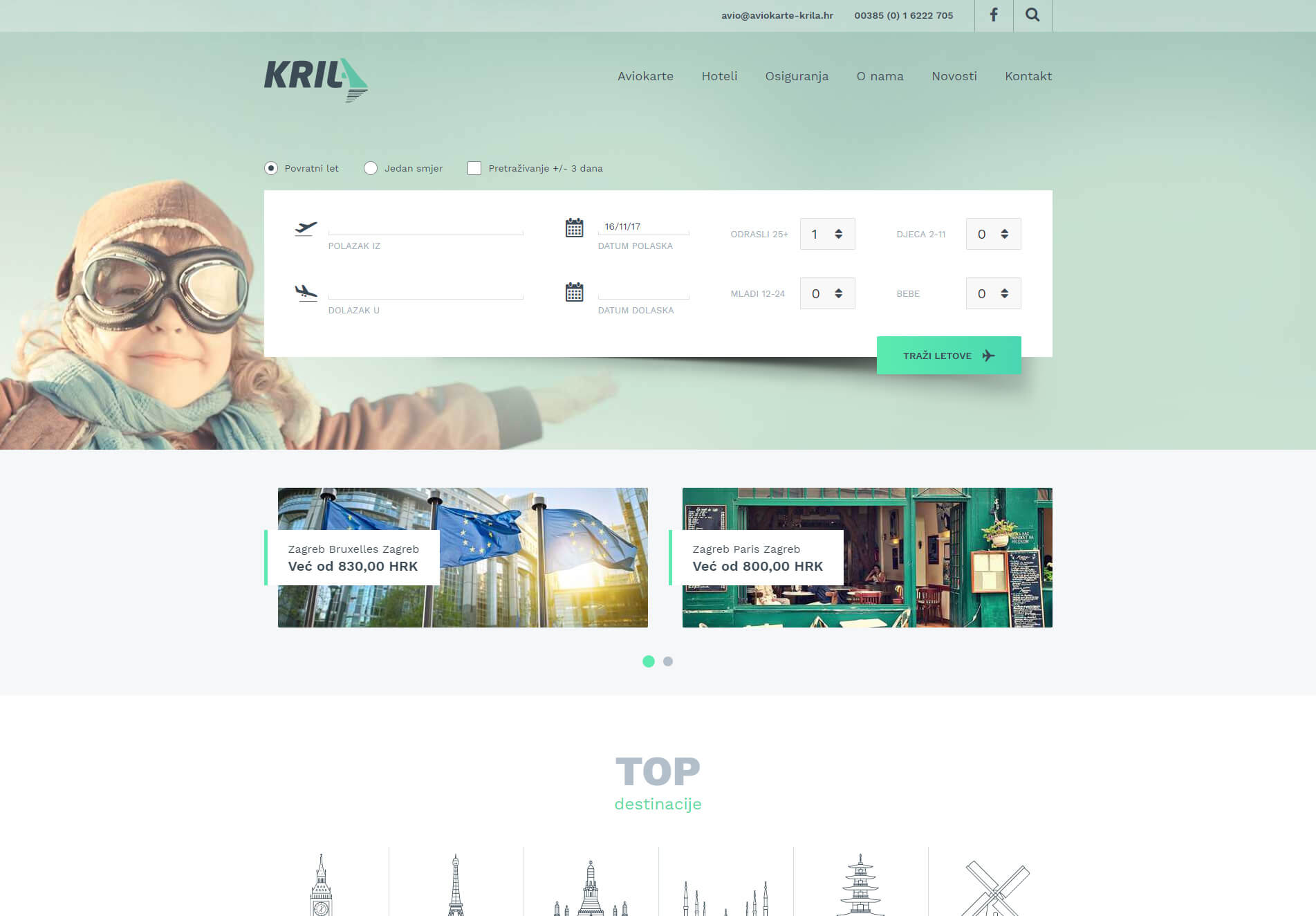 With publishing the new website for Krila d.o.o. we have provided a complete high quality of online service for all users and travellers planning a trip or a holiday, looking for a hotel reservation or insurance, including other tourism services, which is also a company policy. Easy access to plane ticket purchase, review of top travel destinations, selection of hotel facilities by filling in the key fields or insurance form are characteristics of this modern website. In case you have any additional questions during planning or just for your information, feel free to send an inquiry or you can use search option, as well as useful links.