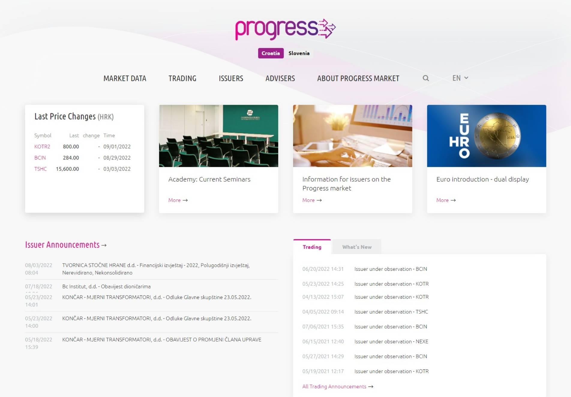 For Zagreb Stock Exchange we have created new Progress market website. Progress market is a multilateral trade platform in Croatia and Slovenia; intended for small and medium–sized enterprises. On the new website, you can keep up-to-date with all actualities, information about trading, securities etc. The website is bilingual – Croatian and English.