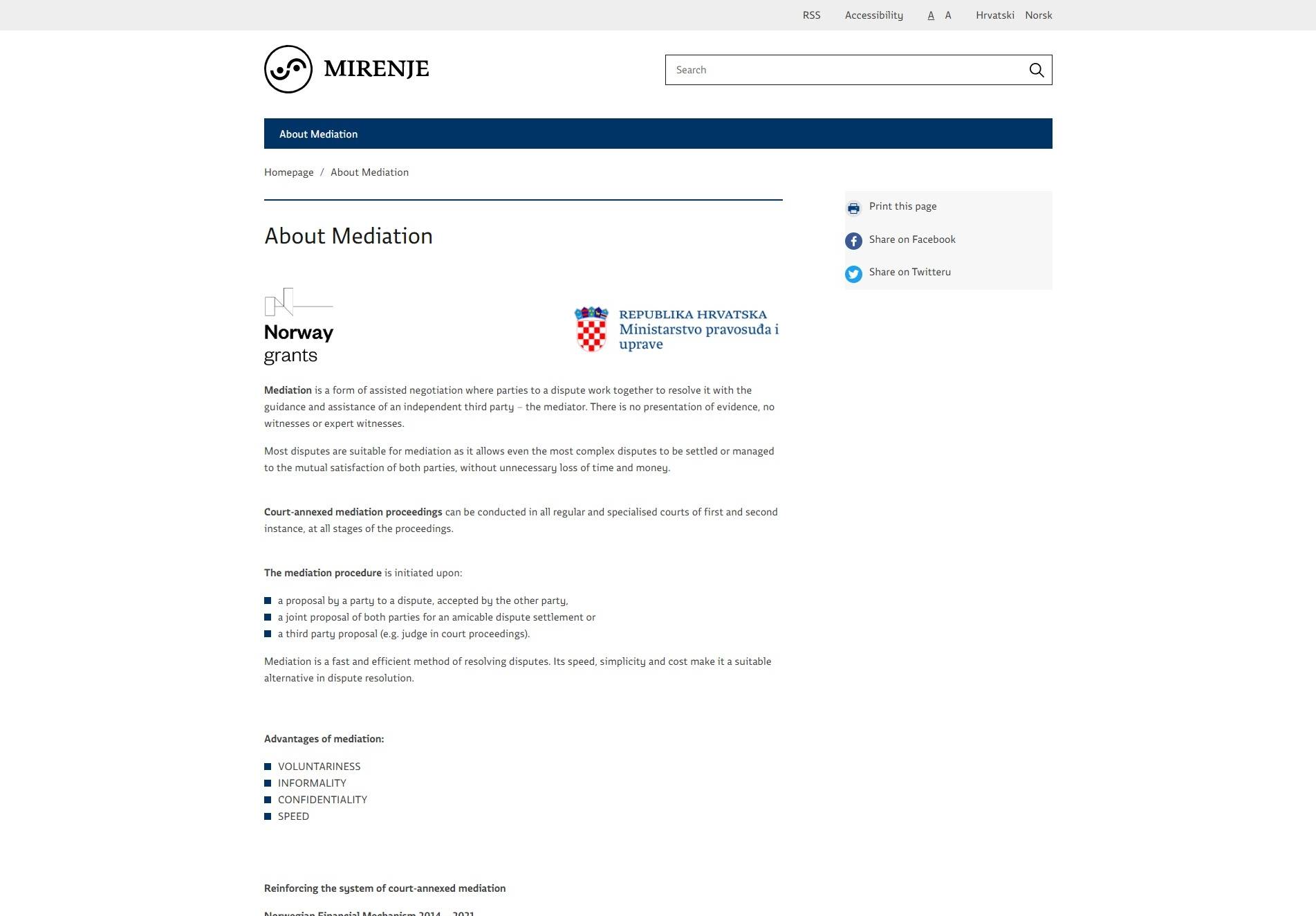 Wir haben eine neue Website für das Ministerium für Justiz und öffentliche Verwaltung erstellt - Vermittlung (mirenje.gov.hr). Auf dieser Website finden Sie alles über die Vermittlung (eine Form der unterstützten Verhandlung, bei der die Streitparteien zusammenarbeiten, um den Streit unter Anleitung und mit Hilfe eines unabhängigen Dritten beizulegen). Außerdem finden Sie hier den rechtlichen Rahmen mit allen Antworten auf die Fragen zur Einleitung der genannten Verfahren.