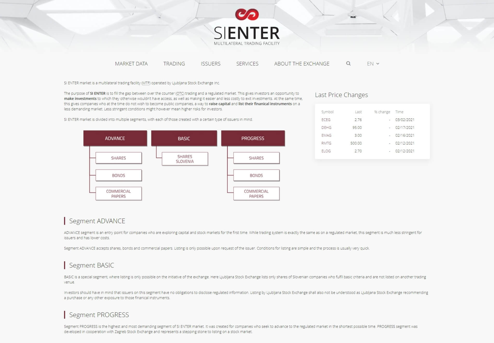 SI ENTER market is a multilateral trading facility managed by the Ljubljana Stock Exchange. Globaldizajn's team of experts simultaneously worked on the development of the new website LJSE and SI ENTER. The purpose of SI ENTER is to enable to fill the gap between free (OTC) trading and a regulated market, which gives investors the opportunity to invest to which they would not otherwise have access, as well as facilitating and cheaper exit from investment.