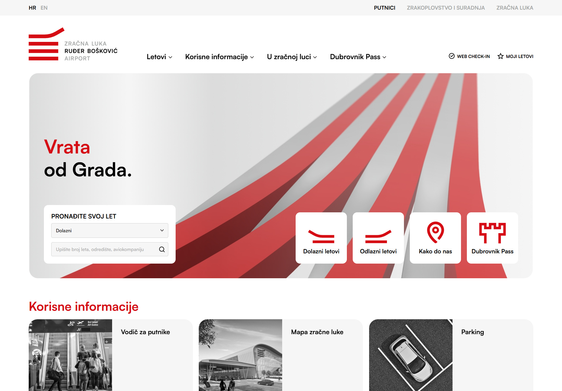 Za Zračnu luku Dubrovnik razvili smo modernu web stranicu koja omogućava putnicima jednostavan pristup svim informacijama vezanim uz letove, usluge i sadržaje u zračnoj luci. Naša stranica nudi mogućnost praćenja statusa letova u realnom vremenu, pregled restorana, trgovina i drugih usluga dostupnih na terminalu. Također, korisnici mogu brzo saznati informacije o parkirnim prostorima, sigurnosnim procedurama i potrebnim dokumentima za putovanja. S ciljem poboljšanja korisničkog iskustva, stranica je optimizirana za sve uređaje, a putnicima pruža sve potrebne informacije na dohvat ruke.